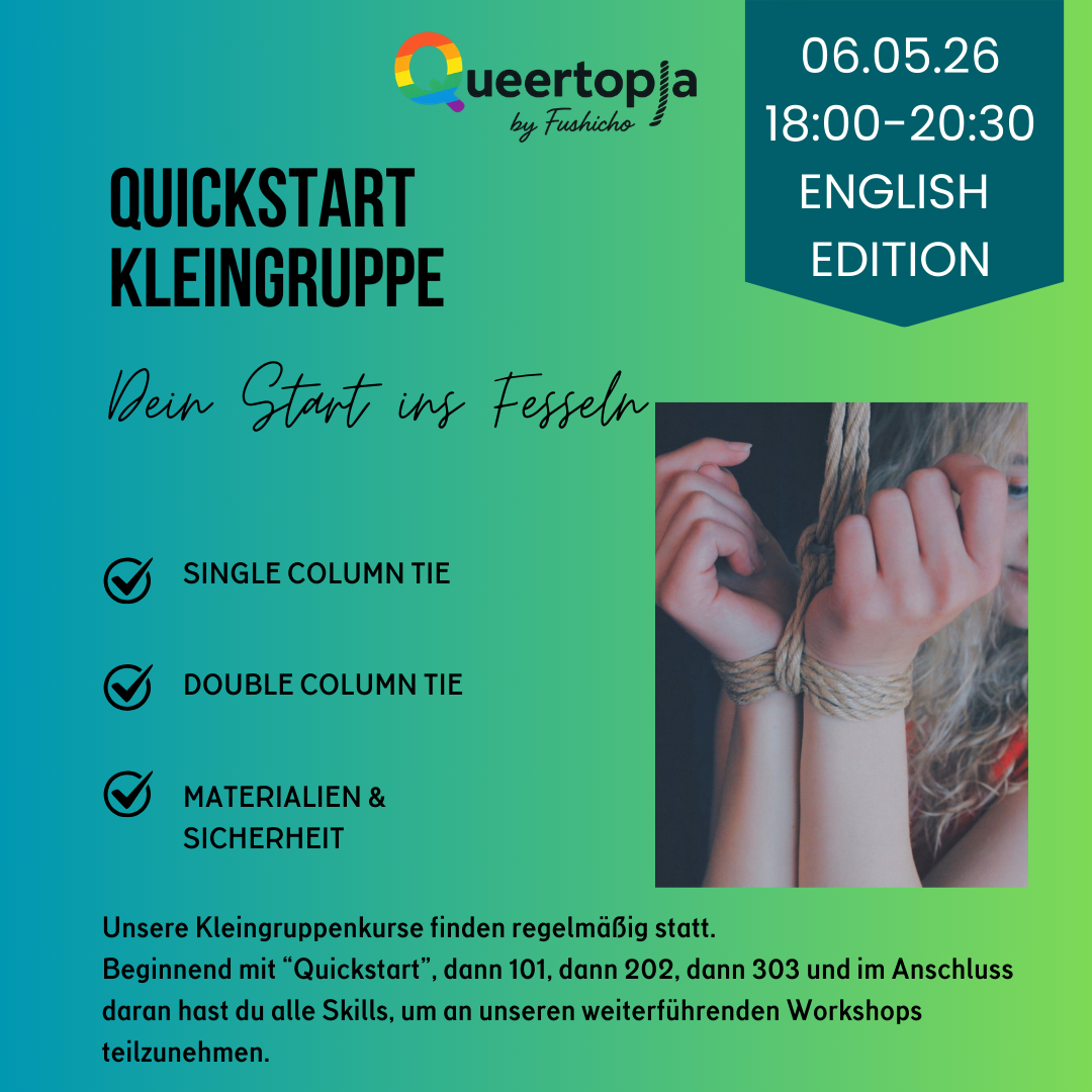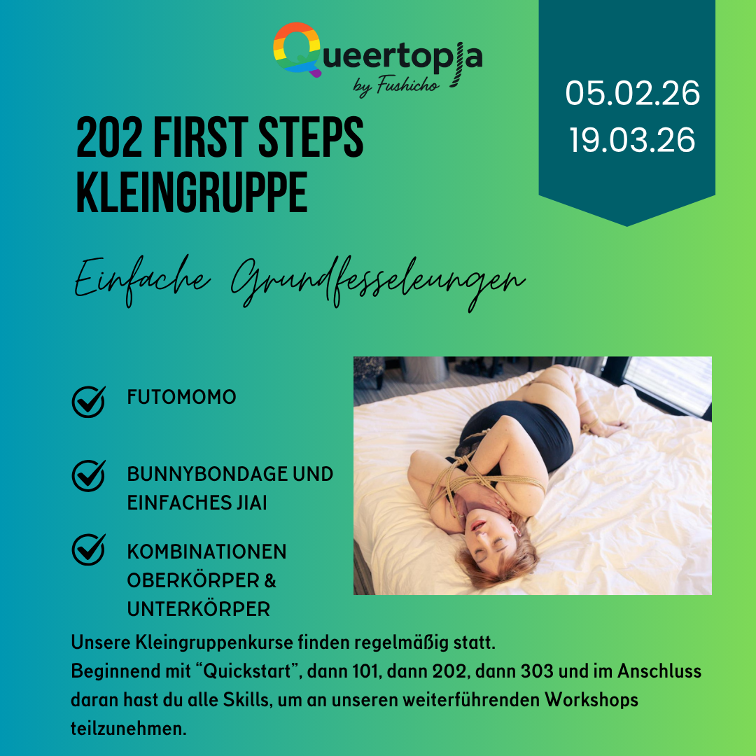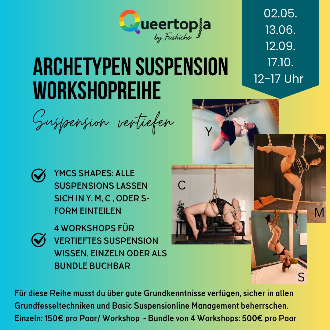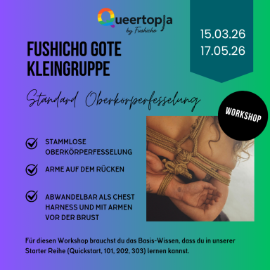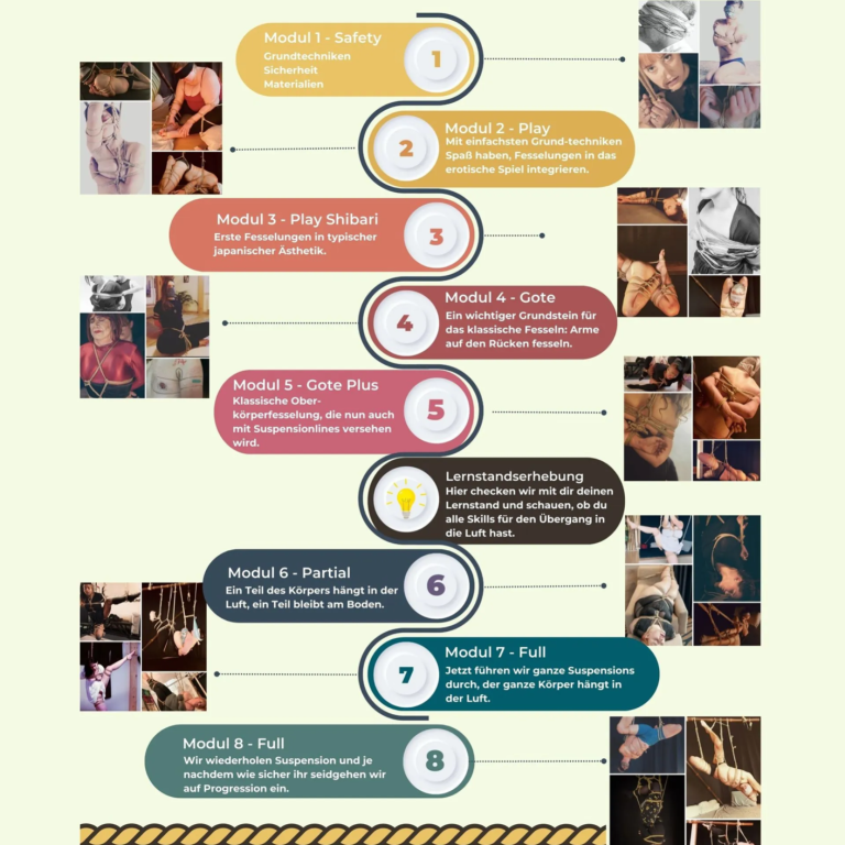 Danach folgen Kurse zur TK/ Gote (klassische Oberkörperfesselung mit den Händen auf dem Rücken) und zu Suspension (das Hängen in der Luft). Die Kurse finden regelmäßig statt, du kannst den für dich passenden Termin aus dem Kalender aussuchen.