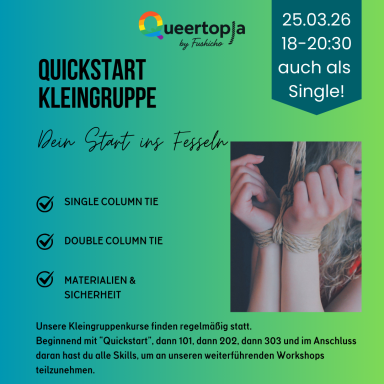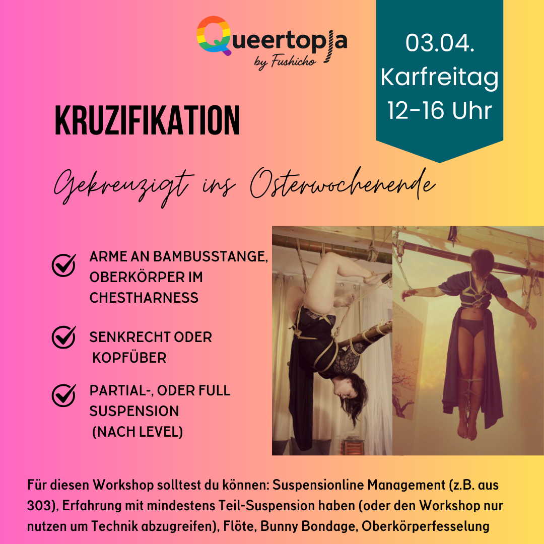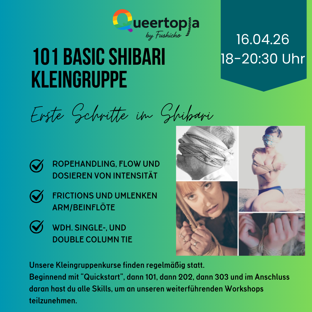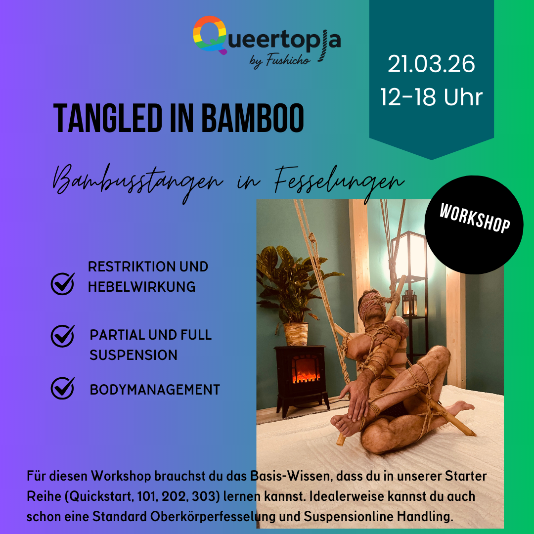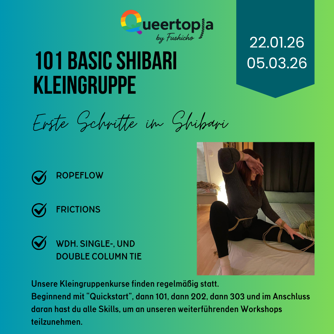 Danach folgen Kurse zur TK/ Gote (klassische Oberkörperfesselung mit den Händen auf dem Rücken) und zu Suspension (das Hängen in der Luft). Die Kurse finden regelmäßig statt, du kannst den für dich passenden Termin aus dem Kalender aussuchen.