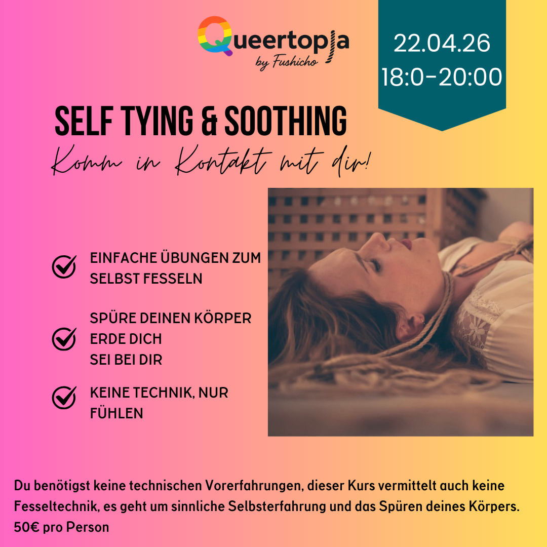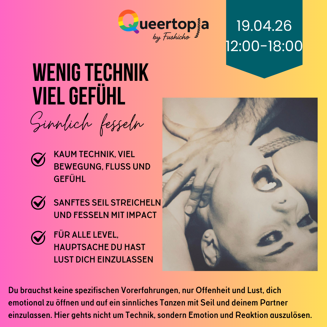 Diese Fesselzeit lässt uns Raum zu erkunden, wohin unsere Fesselreise geht, ob du es magst das Seil eher intensiv oder sanft zu spüren, ob wir mal probieren in die Luft zu gehen oder Grenzen austesten. Wir tasten uns gemeinsam vor indem wir die Intensität langsam steigern, dabei beobachten wie es dir geht und miteinander einchecken.