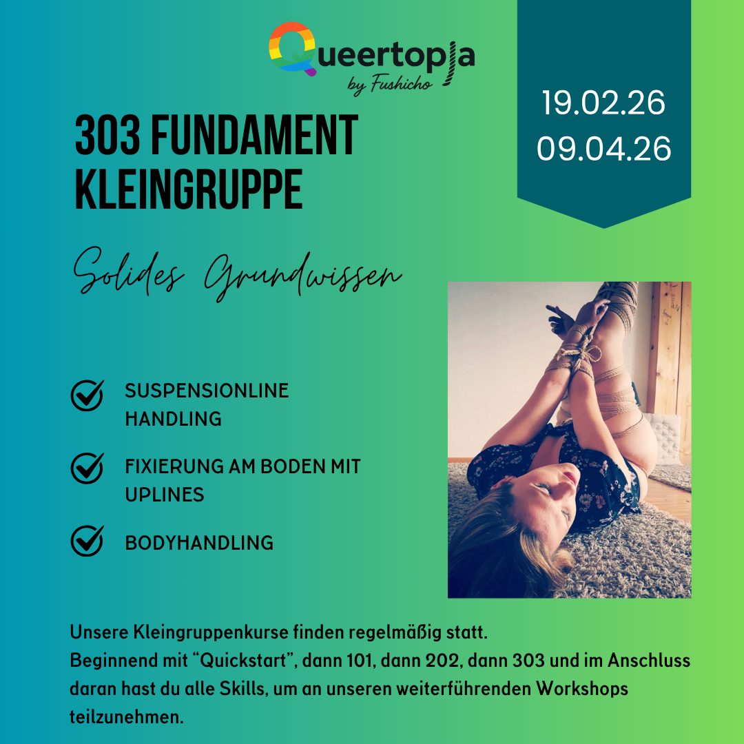 In unserem Quickstart vermitteln wir die Grundtechnik Single-, und Double Column Tie, im 101 lernst du absolute Basics des Fesseln zu Flow und Ropehandling, 202 vermittelt dir schon erste einfache Fesselungen und Kombinationen am ganzen Körper , 303 vermittelt grundlegendes Suspensionline Management und Positionen am Boden mit Uplines.